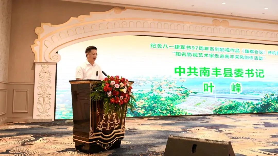 叶峰在致辞中介绍了南丰县基本情况和当地特色文化。他表示,系列影视作品《康都会议》既是宣扬红色主旋律,打造南丰县文化主阵地的光影表达,更是展示南丰县风土人情、宣传推介南丰县的难得机遇。南丰县将全力配合好、服务好拍摄团队各方面工作,共同将该作品打造成为展示南丰文化特色、深受群众喜爱的经典佳作。