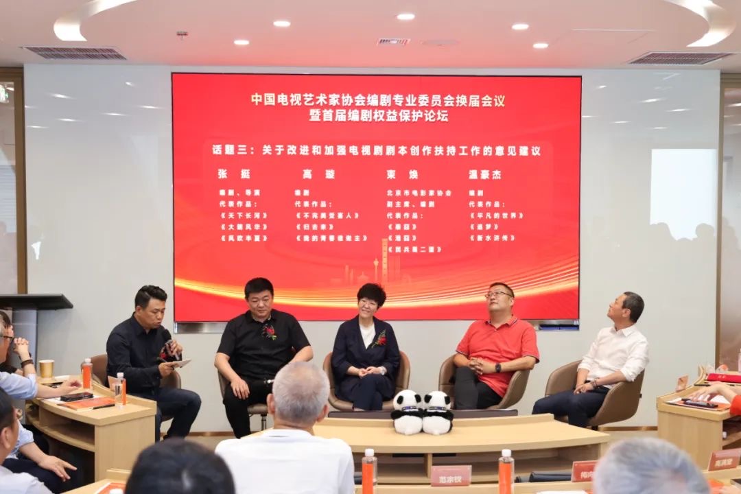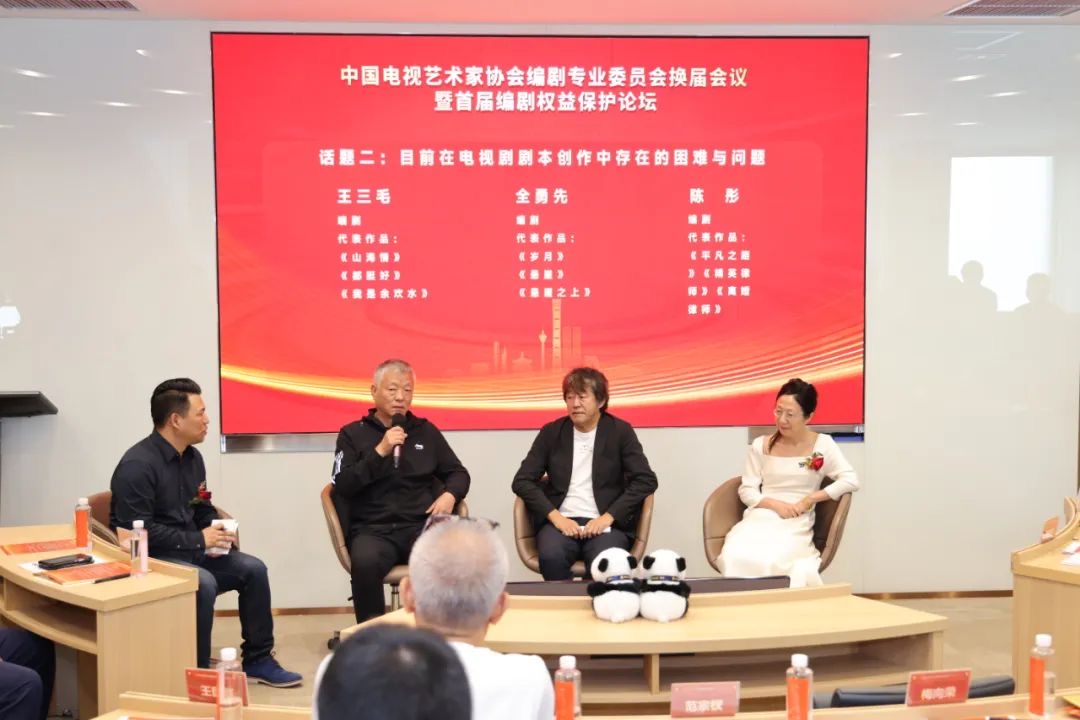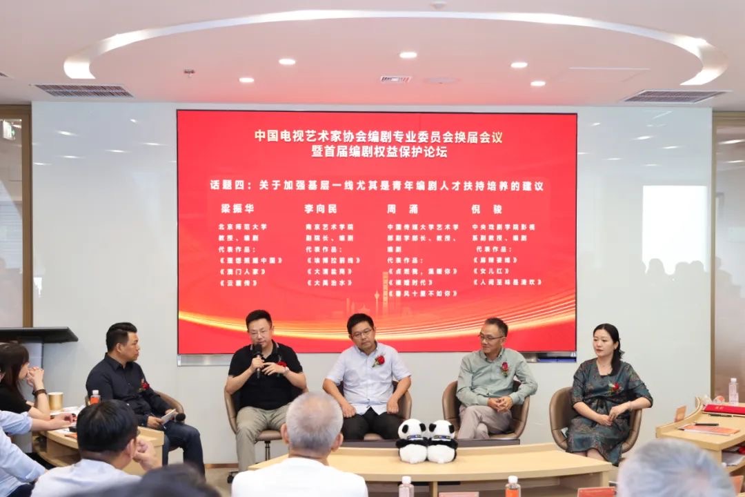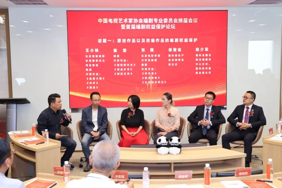 换届会议结束后,编剧专业委员会召开了首届编剧权益保护论坛。北京紫禁城影业有限责任公司总策划、编剧王小枪,编剧秦雯,北京电影学院文学系教授、编剧张巍,盈科娱乐产业法律事业部主任徐智省,盈科全国合规法律服务中心主任、盈科杭州管委会副主任陈少军就原创作品以及改编作品的编剧权益保护进行研讨;编剧王三毛,编剧全勇先,编剧陈彤就目前电视剧剧本创作中存在的困难与问题进行交流;导演、编剧张挺,编剧高璇,北京市电影家协会副主席、编剧束焕,编剧温豪杰就关于改进和加强电视剧剧本创作扶持工作交流了意见建议;北京师范大学教授、编剧梁振华,南京艺术学院副院长、编剧李向民,中国传媒大学艺术学部副学部长、教授、编剧周涌,中央戏剧学院影视系副教授、编剧倪骏就关于加强基层一线青年编剧人才扶持培养进行了交流研讨。